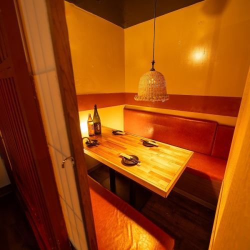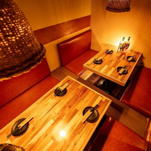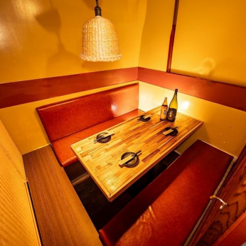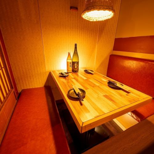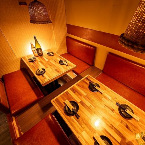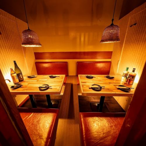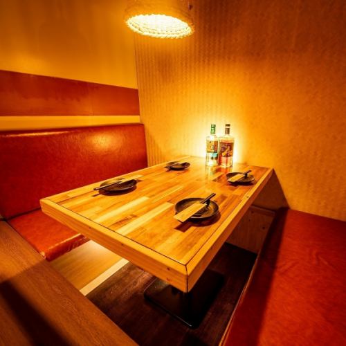 有門的私人房間是可以不用擔心周圍人而安靜用餐的人氣座位。溫暖的燈光和木質紋理讓人感到舒適,紅色基調的座椅營造出一種平靜的氛圍。它非常適合約會和小組談話,以及與朋友一起喝酒和招待客戶。對於團體使用,可以將桌子連接起來以容納較大的團體。